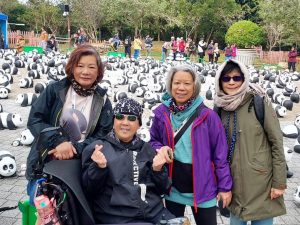 Irene (图右2) 成为复康会义工队-康乐线的义工已有12年,回想当初不太懂得与残疾人士沟通,经过不断学习和探索,现已更为熟练。每次发掘到新的路线,预备功夫十足,先由热心的义工多次探路,再由职员带同使用电动轮椅的同路人义工实地考察,确保路路畅通,务求使参加者有安全又愉快的旅途。当见到参加者踊跃出席,开心的笑脸,还带着愉快的心情回家,她就感到满满的幸福了。她希望自己能持续有心有力,一路同行。