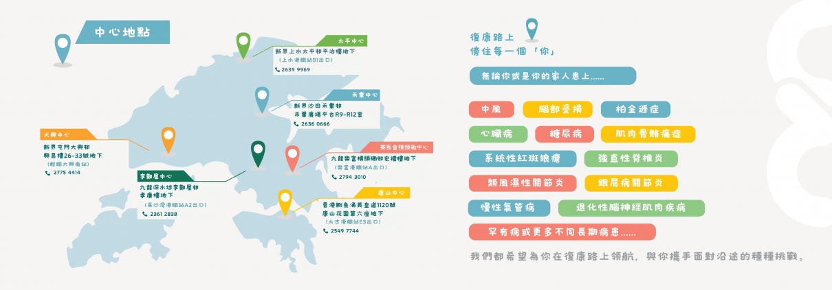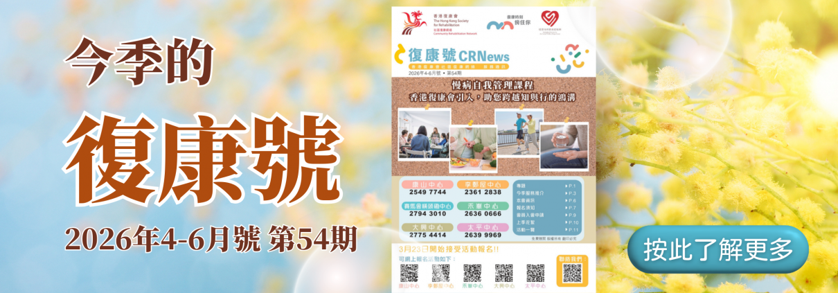 自1994年,香港復康會社區復康網絡(CRN)以為長期病患者及照顧者提供一站式復康服務為使命,由社工、心理健康主任、註冊護士、物理治療師及職業治療師等組成跨專業團隊,為長期病患者及照顧者提供支援,並促進同路人自助互助,讓你及早面對和適應患上及陪伴長期病的生活,務求以不同的模式來為你提供最優質的服務。不論你或你家人患上甚麼疾病,我們社區復康網絡都會時刻傍住你。