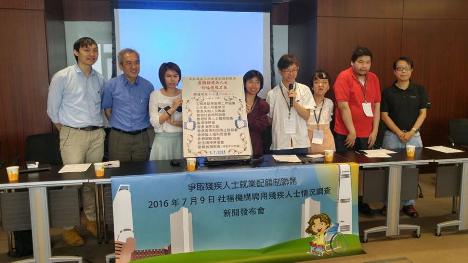 香港复康会研究及倡议中心受「争取残疾人士就业配额制联席」委托进行问卷调查,访问了30间受政府资助的社福机构,发现其整体残疾人士的平均聘用率为 4%,然而根据个别机构的聘用情况发现,逾五成六受访机构聘用残疾人士的平均率低于2%,当中三成六更没有聘用;而按机构规模而言,100人或以下的机构有超过六成四没有聘用残疾人士。