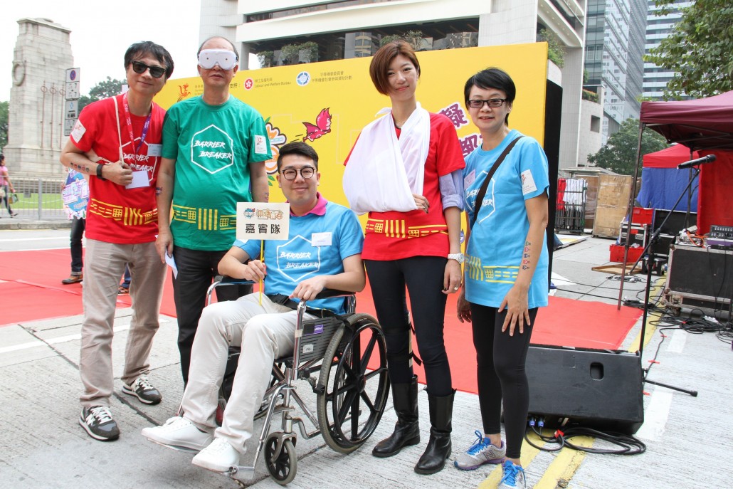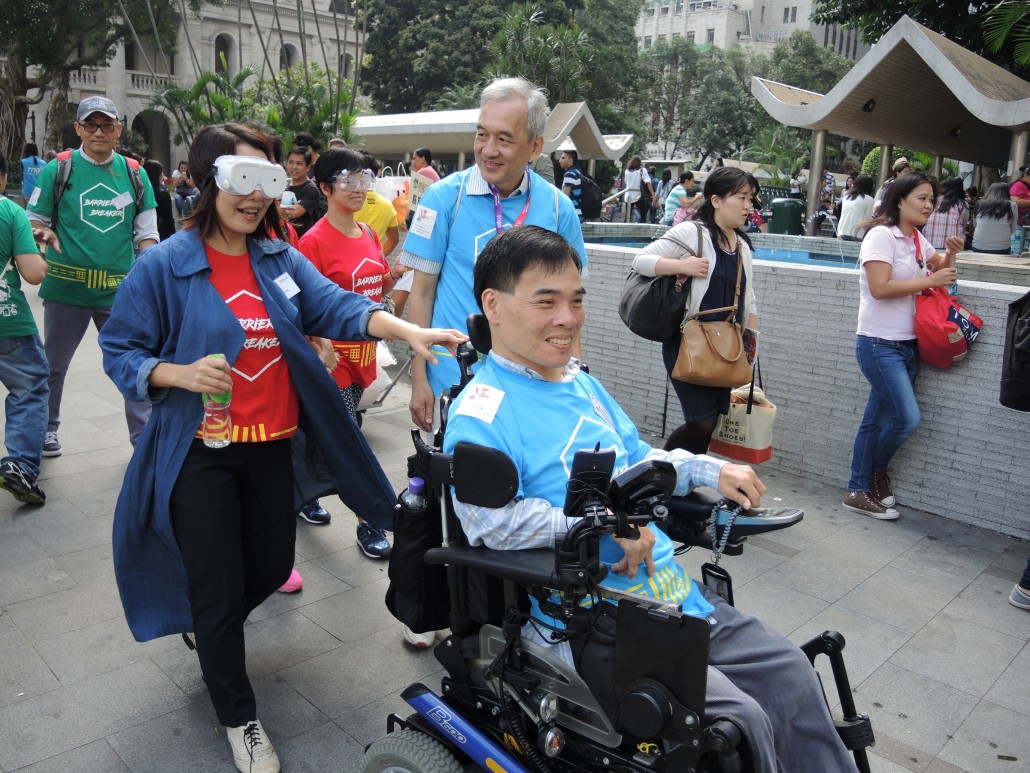 嘉賓體驗活動中,立法會議員劉小麗帶上特製眼罩模擬青光眼患者;立法會議員劉國勳需要以輪椅使用者及立法會議員容海恩以中風人士的角色去完成無障礙任務。